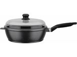 Die Schmorpfanne hat einen Durchmesser von 24 cm und wird mit einem Glasdeckel geliefert. Sie hat ein geringes Gewicht von nur 1,65 kg, was die Handhabung erleichtert.